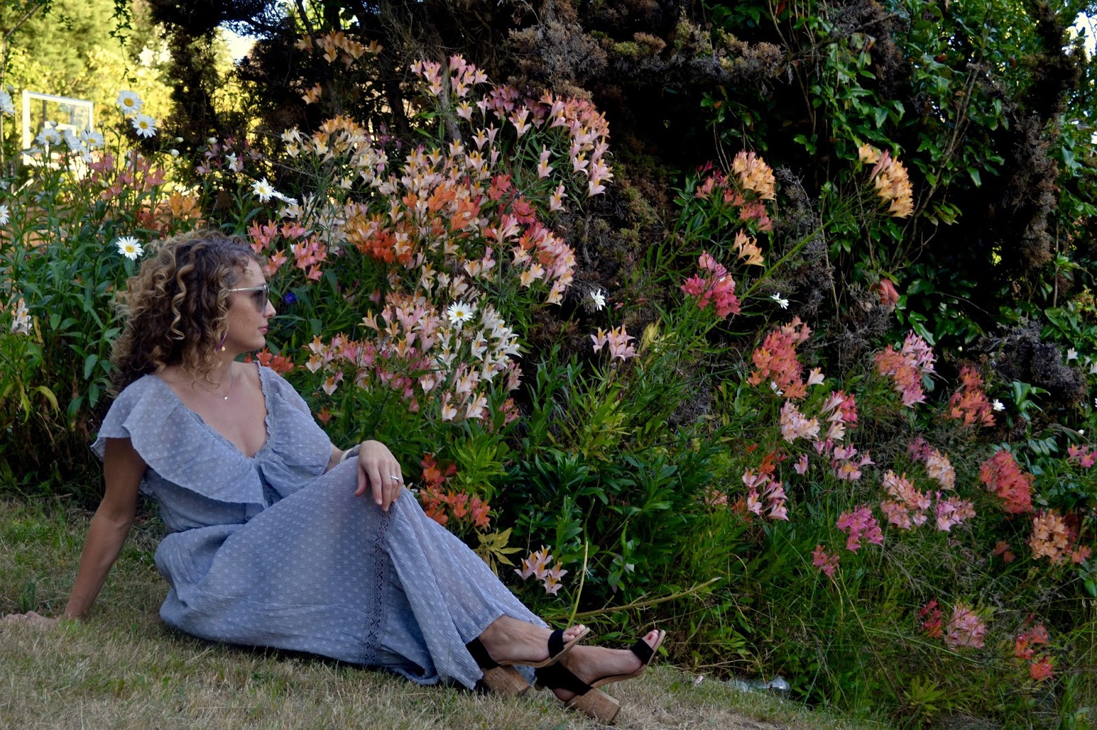 It's swiss dots, reminiscent of sweet girly dresses, but the gray makes it modern and grown up. And who doesn't love ruffles? This dress is great for those of us who aren't well endowed up above. I love the V back too. It runs a tad small, I would say if you are in between sizes go with the larger size - if you want to breathe.